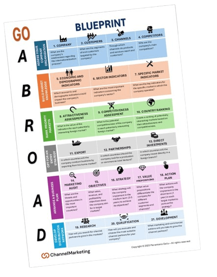 GOABROAD Blueprint is the tool that in just one page guides you through the 6 phases and 21 steps of the GOABROAD© method, to always have a clear idea of what to do and how to do it, at every stage of your internationalization project.